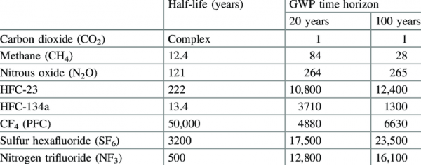 This table [6] shows a comparison of the heat-trapping ability of different greenhouse gases, which are represented using the gases’ Global Warming Potential, or GWP. GWP is a unit to compare gases’ heat trapping potential using carbon dioxide as a baseline (GWP = 1), across different time scales (usually 20 years and 100 years are used in calculations).